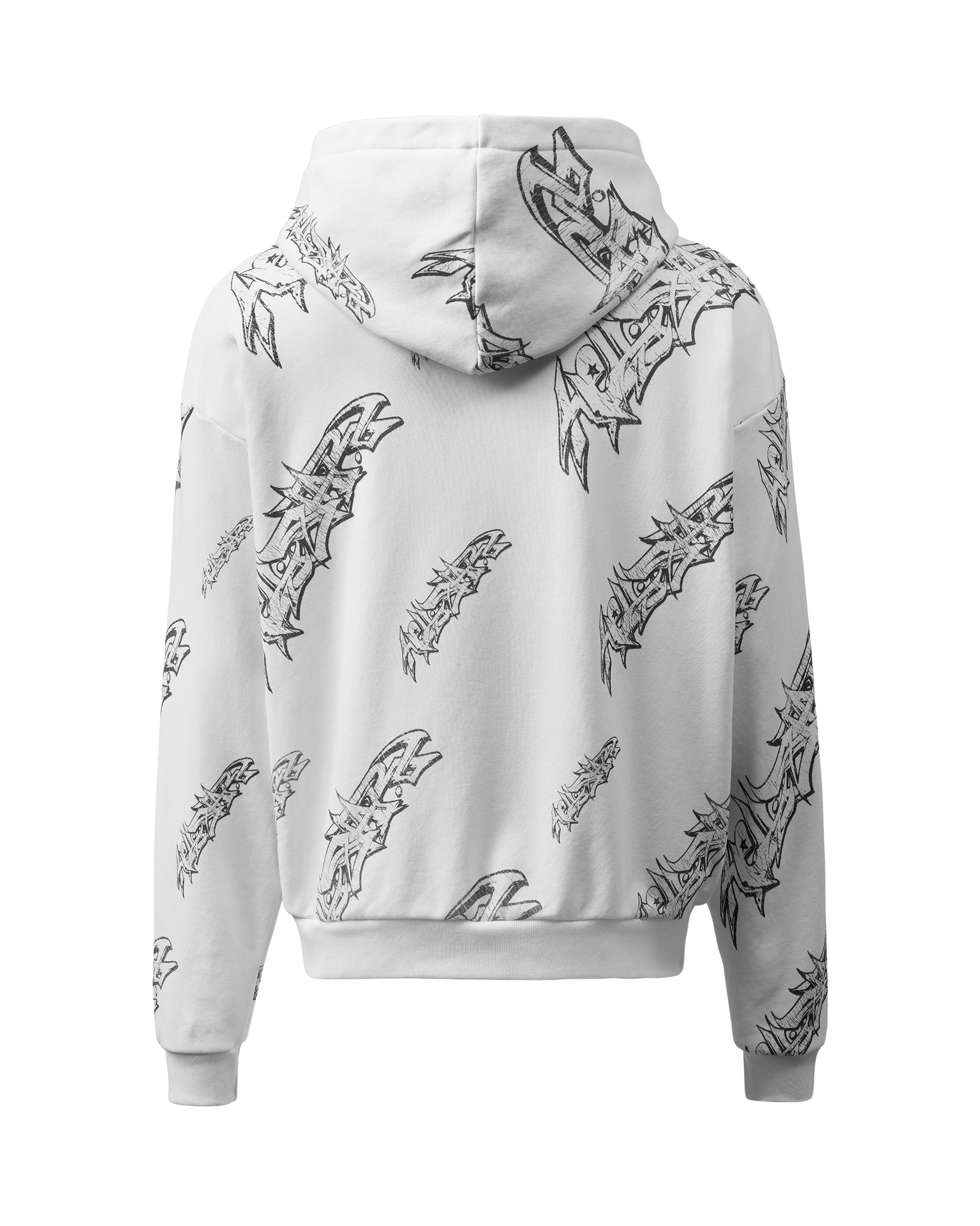 Identical construction to the black version — heavyweight cotton fleece, full-length zip, oversized relaxed fit, roll print applied post-construction. The white colourway requires more attention when washing but the fabric quality and print process are built to last when cared for correctly.