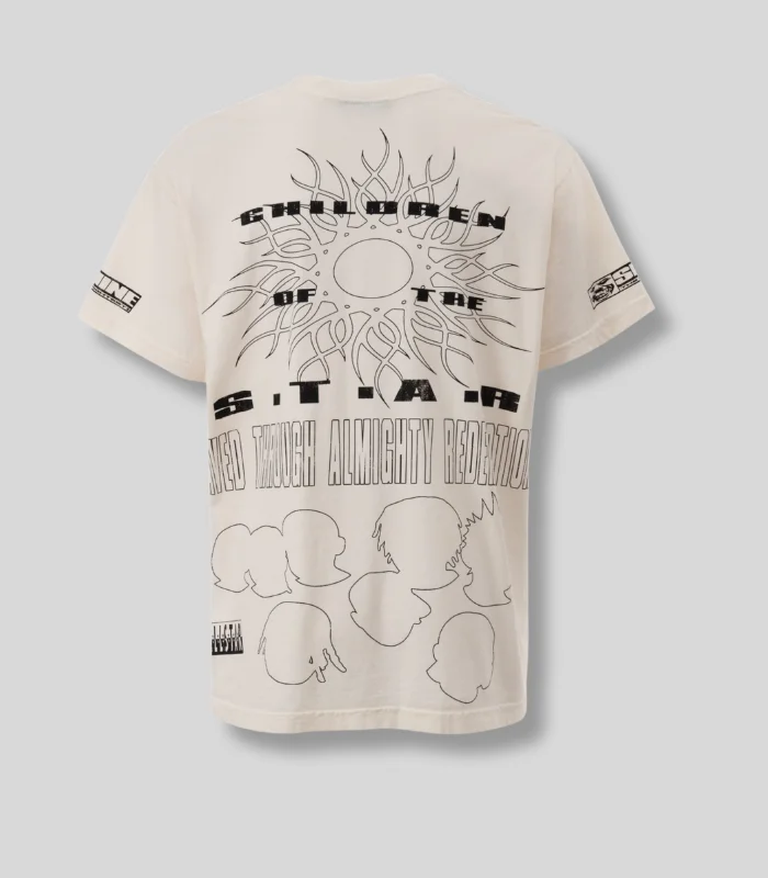 Heavyweight cotton. White base that allows the full complexity of the Children of the Stars graphic to read clearly. The print covers the chest and back with a composition that tells a story rather than simply displaying a logo. Relaxed fit. Premium print quality.
